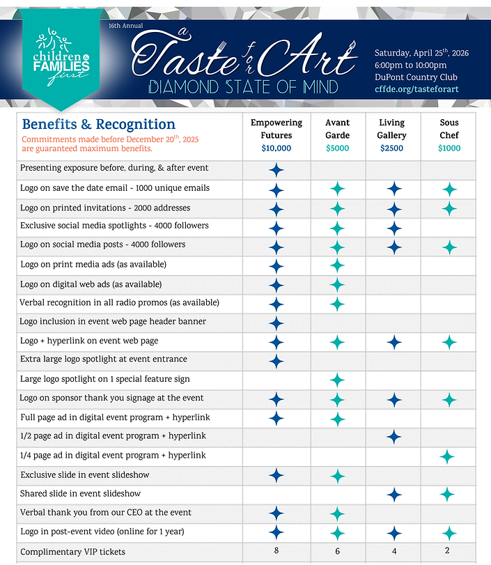 Why be a sponsor? Your sponsorship is an investment with multi-faceted return. Welcoming more than 350 guests each year, this award winning event holds the captive attention of Delaware’s most influential corporate, civic, and community members because it supports, Children & Families First - one of Delaware's longest-standing and most respected non-profits, whose mission and work they've proudly supported for many years.